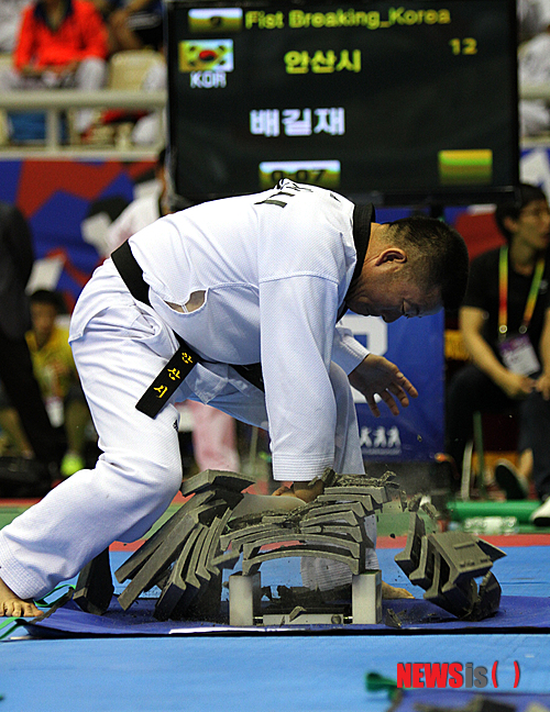 한마당 이틀째인 22일 경북 포항실내체육관에서 태권도 고수 9명이 참가한 가운데 열린 이 부문 결선에서 배길재 사범은 신청한 기왓장 12장 중 10장을 격파, 우승을 차지했다.