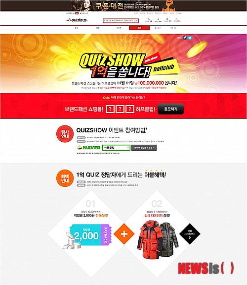하이라이트는 고객 이벤트 '하프클럽 퀴즈쇼, 1억원을 쏩니다'로, 5만명을 대상으로 응모만 해도 적립금 2000원을 증정한다. 참여고객 중 100명에게는 추첨을 통해 인기상품 '밀레 코트형 구스다운점퍼'를 1000원에 구매할 수 있는 기회를 제공한다.