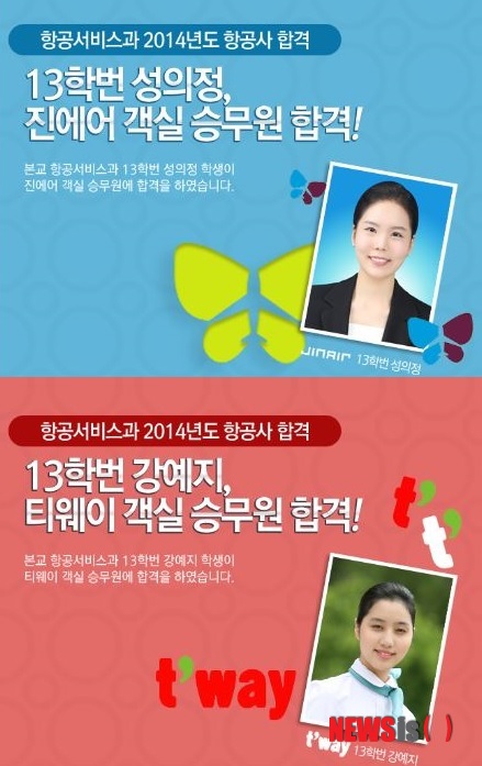 학교측에 따르면, 2013학번 성의정(2학년)양이 진에어 객실 승무원으로 최종합격한 데 이어 같은 13학번 강예지(2학년)양은 티웨이항공 객실 승무원에 최종합격했다.