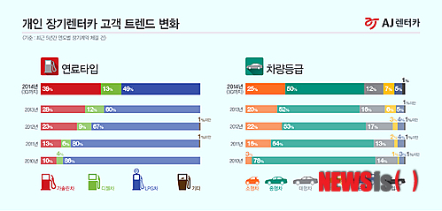차급에 따른 선택 비중은 소형차가 올해 3분기말 기준 25%까지 늘어나 2010년 3%보다 22%p 증가한 반면 중형차는 2010년 78%에서 2014년 9월말 기준 50%까지 줄었다.
