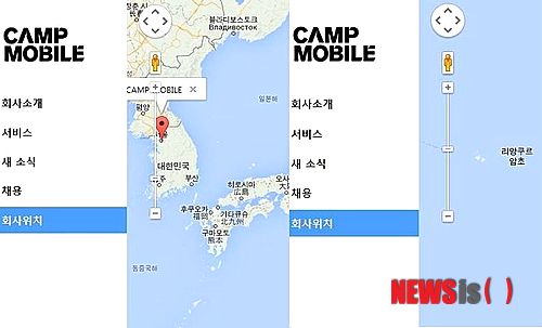 먼저 캠프모바일 한국 사이트에서 '회사위치' 안내에 들어가 보니 지도상에 '일본해'로 표기돼 있는 것을 확인할 수 있었다. 독도는 프랑스와 유럽에서 쓰는 리앙쿠르 암초로 표기돼 있다.