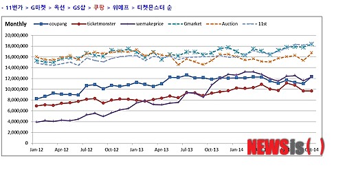 【서울=뉴시스】김민기 기자 = 쿠팡이 지난 10월 PC와 모바일 전체 통합 순 방문자수 소셜커머스 업계 1위 자리를 탈환했다.