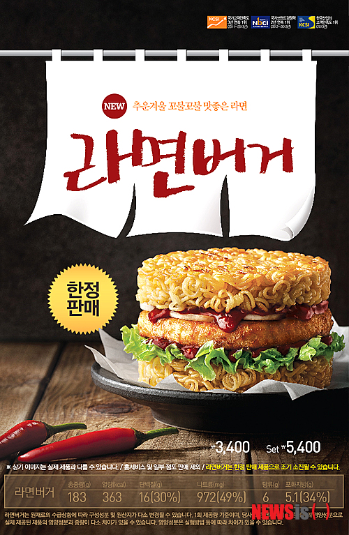 롯데리아는 6일부터 라면을 햄버거에 접목한 '라면버거'를 전국 매장에서 50만개 한정 판매키로 했다.