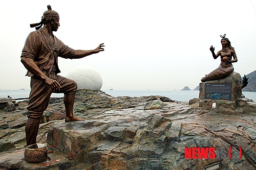 브론즈 동상에도 이런 전설이 고스란히 녹아있다. 한 손에는 여의주를 든 아리따운 인용(높이 1.7~1.8m)과 헌헌장부로 표현된 젊은 어부(높이 1.9~2m)가 금세 눈물을 떨굴 듯 절절한 표정으로 서로를 향해 손을 내뻗고 있는 모습은 보는 사람의 가슴까지 저리게 한다.