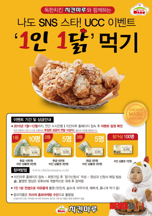 이러한 인기에 보답하기 위해 치킨마루가 고객들을 위한 '나도 SNS스타! 1인 1닭 UCC 이벤트'를 실시한다. 치킨마루 '1인 1닭'을 콘셉트로 자유롭게 촬영한 동영상을 오는 2월23일까지 제출하면 된다.