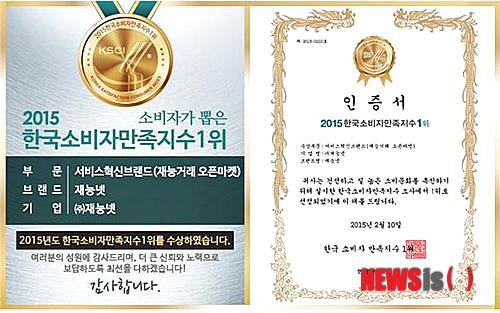 【서울=뉴시스】유희연 기자 = 신개념 오픈마켓 '재능넷'(www.jaenung.net)이 '2015 한국소비자만족지수 1위' 서비스혁신브랜드(재능거래 오픈마켓) 부문에서 1위를 수상했다.