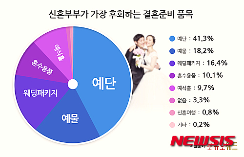 이어 웨딩패키지(16.4%), 혼수용품(10.1%), 예식장(9.7%)이 뒤를 이었다. 반면 신혼여행 비용은 불과 0.8%만이 후회한다고 답했다.