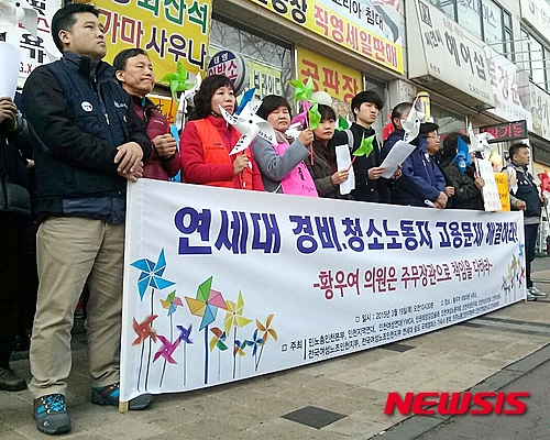 이날 지역 시민단체는 연세대 측에 '근로조건 저하 없는 고용 보장'과 황우여 부총리 측에 '주무 장관이자 지역구 국회의원으로서 자신의 역할을 다 할 것'을 요구했다.