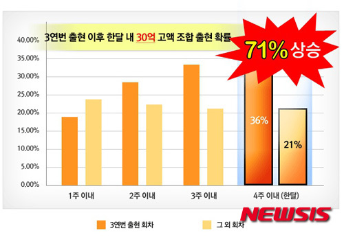 해당 연구소 측은 “로또 ‘3연번’ 출현 이후 한 달 이내에 1등 당첨금이 30억 이상의 고액일 확률은 평소보다 71%이상 높아진다. 30억 이상 고액의 로또1등 당첨금을 원한다면 3연번 출현 이후를 노려야 한다”고 말했다.