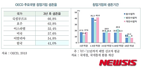 문제는 '생계형 창업'에만 집중된 나머지 절반 이상의 창업 기업이 '죽음의 계곡'을 빠져나오지 못하고 무릎을 꿇고 만다는 점이다. OECD의 2013년 조사에 따르면 3년 후 생존율은 ▲룩셈부르크 66.8%, ▲호주 62.8% ▲이스라엘 55.4% ▲미국 57.6% ▲이탈리아 54.8% 등인 반면 한국은 41.0%에 그쳤다. OECD 17개 주요 회원국 중 최하위다.