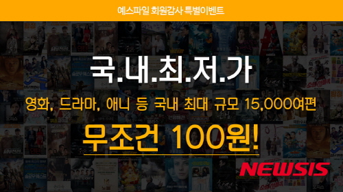 【서울=뉴시스】유희연 기자 = 국내 최대 실시간 파일공유 웹하드 서비스인 ‘예스파일’(www.yesfile.com)이 영화, 드라마, 애니 등 1만5000여 콘텐츠를 100원에 제공하는 회원감사 특별 이벤트를 진행한다.