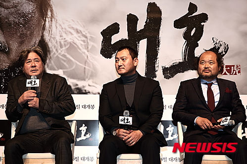 170억 원이 투입된 대작이자 12월 성수기 극장가에서 ‘히말라야’와 경쟁할 박훈정 감독의 신작 ‘대호’가 10일 압구정CGV에서 제작발표회를 열고 조선의 마지막 호랑이를 대형 스크린에 공개했다. 이날 행사에는 배우 최민식(53), 정만식(40), 김상호(45)와 박훈정(41) 감독이 참석했다.