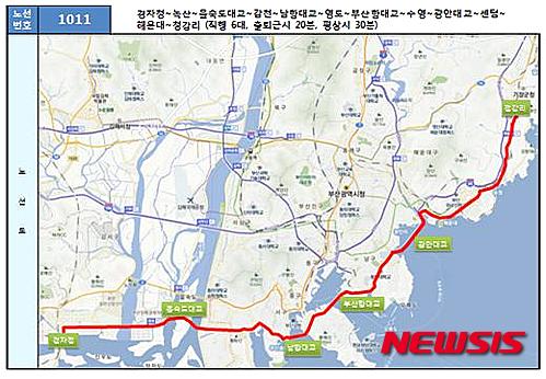 해운대에서 광안대교~부산항대교~남항대교~을숙도 대교를 통과해 강서산단 등 해안일주도로 주요대교 구간을 직통으로 연결하는 이 노선은 1011번 버스(6대)가 30분 간격으로 운행된다.