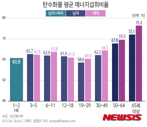 보건복지부가 26일 발표한 '2015 한국인 영양소 섭취기준' 자료에 따르면 50~64세 남자의 탄수화물 섭취량은 전체 에너지 섭취량의 67.8%, 50~64세 여성은 69.6%였다.