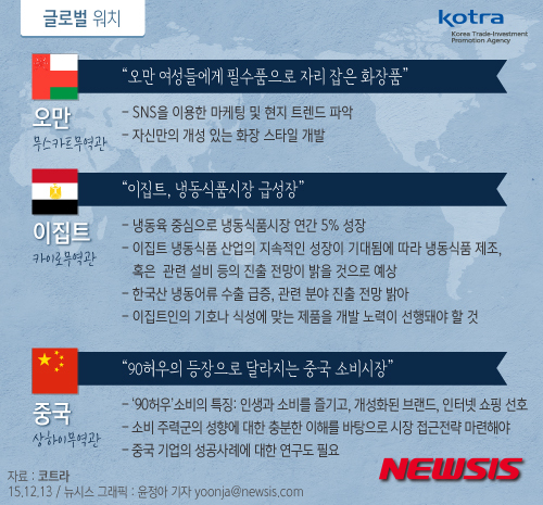 코트라 무스카트무역관 관계자는 "오만 여성들은 개성에 맞는 화장품을 찾고 있다"며 "한국 제품처럼 새로우면서도 높은 품질과 가격경쟁력이 있는 제품에 대한 관심이 증가하고 있다"고 밝혔다.