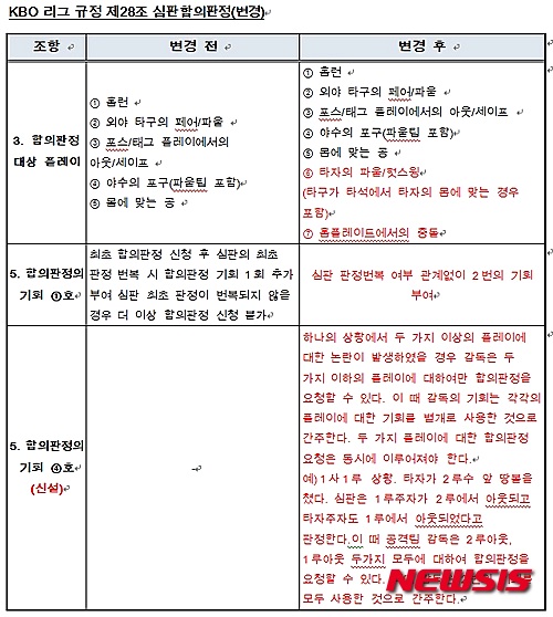 아울러 타구가 타석에서 타자의 몸에 맞는 경우를 포함한 타자의 파울 및 헛스윙, 홈플레이트에서의 충돌도 합의판정을 요청할 수 있게 됐다.