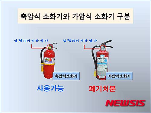 유인무 제천소방서 예방안전과장은 "낡은 가압식 소화기를 폐기하려면 가까운 소방관서를 통해 폐기하면 된다"며 "새 소화기로 교체해 화재발생에 대비하는 자발적인 시민 안전의식 향상이 필요하다"고 당부했다.