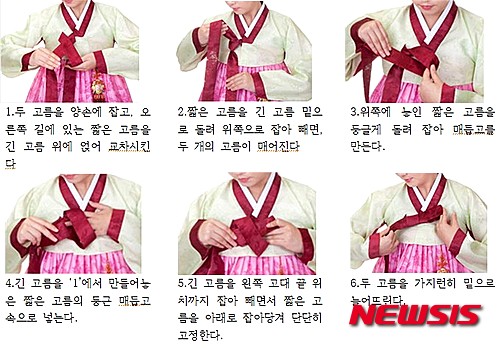 1.두 고름을 양손에 잡고, 오른쪽 길에 있는 짧은 고름을 긴 고름 위에 얹어 교차시킨다