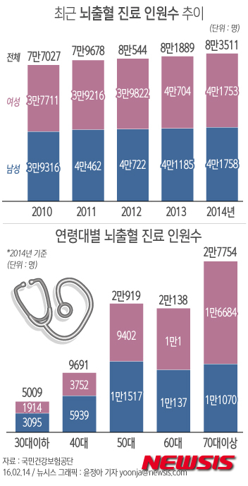 14일 국민건강보험공단에 따르면 '뇌출혈' 진료인원은 2010년 7만7027명에서 2014년 8만3511명으로 연평균 2.0% 증가했다.