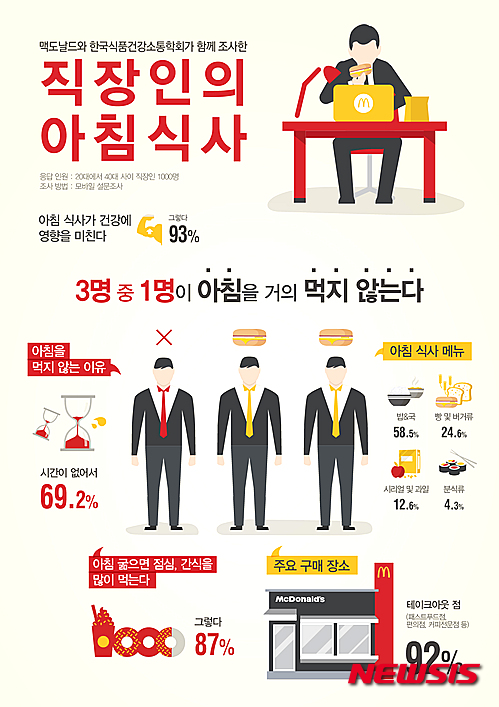 지난 7일 아침 메뉴의 원조격인 맥모닝으로 유명한 맥도날드는 한국식품건강소통학회와 함께 20~40대 직장인들을 대상으로 이들의 아침 식사 행태와 관련된 설문조사를 실시했다.
