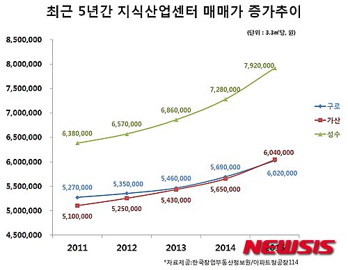 5일 한국창업부동산정보원에 따르면 이들 지역의 지식산업센터 매매가격은 지난 2011년부터 2015년까지 5년 동안 18.9% 상승했다.