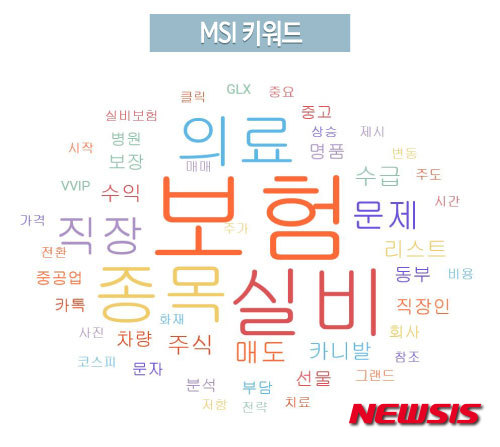 이날 코스콤과 뉴시스가 공동으로 분석해 뽑아낸 빅데이터 시장심리지수(MSI)에 따르면 전거래일 오후 4시부터 이날 오전 8시까지 온라인과 소셜미디어에서 집계된 상위 키워드는 보험, 실비, 종목, 의료, 직장 등으로 조사됐다.