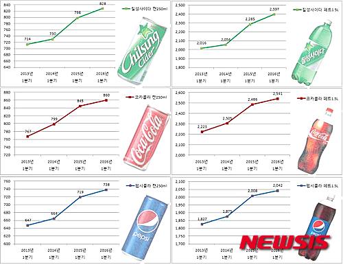 27일 한국소비자단체협의회 물가감시센터는 대표 탄산음료 브랜드가 출시한 캔250㎖, 페트 1.5ℓ 제품에 대해 2013년부터 2016년 1분기까지 가격을 조사한 결과 이같이 나타났다고 밝혔다.