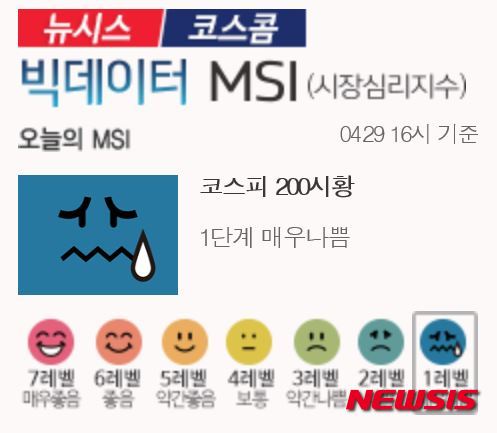 【서울=뉴시스】한상연 기자 = 29일 빅데이터로 뽑은 코스피200 종목 시장심리지수(Market Sentiment Index·MSI)는 오전 '매우 나쁨' 수준에서 시작, 오후에도 변함없이 마무리 됐다.