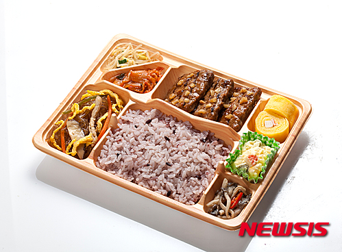 흑미밥과 잡채, 느타리버섯볶음, 맛살에그롤, 콩나물무침, 볶음김치, 에그샐러드가 도시락에 담겼다. 떡갈비는 직화 불맛 소스를 묻혀 달콤한 맛과 부드러운 식감을 살렸다.