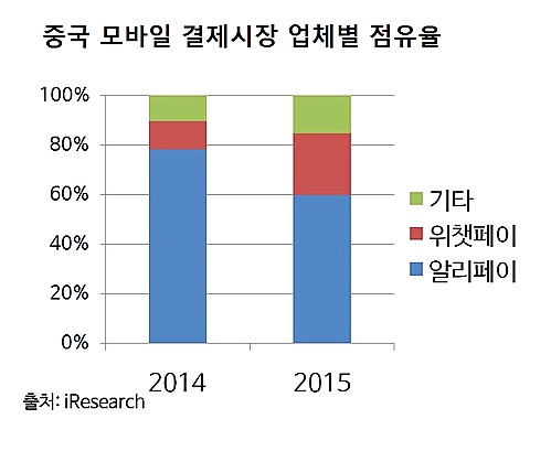 반면 중국 최대 메신저 및 게임업체인 텐센트의 위챗페이 점유율은 2014년 11%에서 지난해 20%까지 2배 가까이 뛰었다.