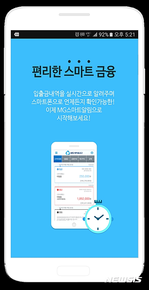 【서울=뉴시스】정필재 기자 = 새마을금고는 스마트폰으로 입출금거래내역과 금융안내 등을 무료로 알려주는 'MG스마트알림'서비스를 출시한다고 7일 밝혔다.