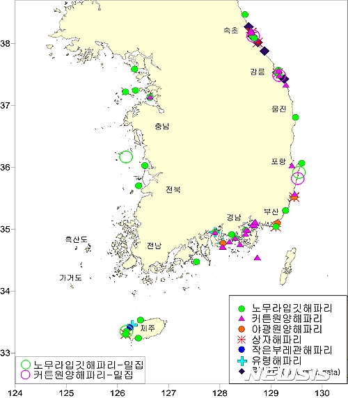 동해안의 속초·강릉·포항 일부 해역에서는 커튼원양해파리와 노무라입깃해파리가 밀집 출현하고 있고, 더불어 상자해파리, 야광원양해파리, 아우렐리아 림바타 등도 출현하고 있다.