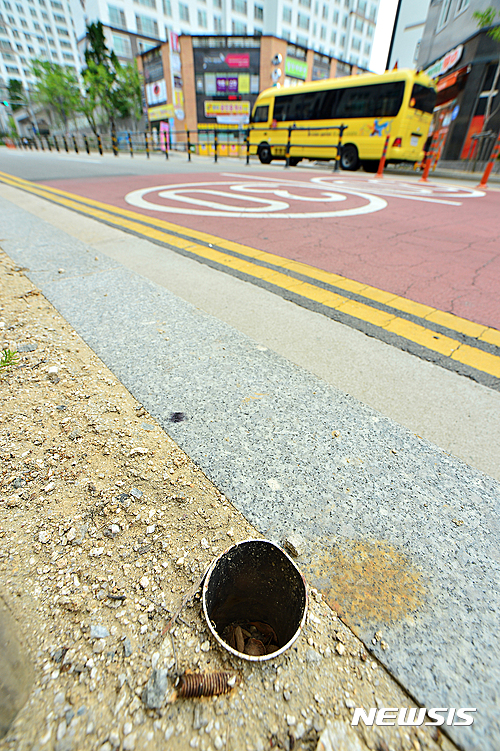 어린이보호구역 200m 구간 중 안전펜스가 사라진 곳은 스테인리스 기둥 밑 부분은 예리한 도구로 자른 듯 날카로운 절단면이 그대로 드러나 있다.