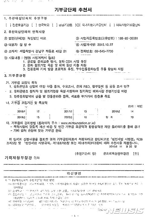 미르재단은 관인이 빠진 서류를 제출했음에도 같은해 12월 24일 기재부의 지정기부금 단체 승인을 받았다.