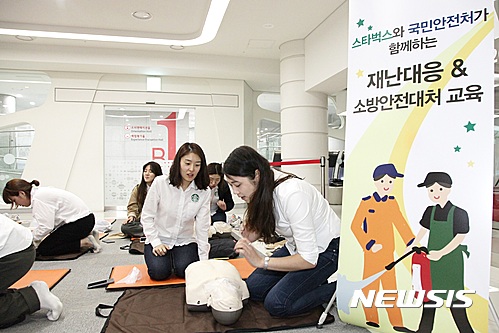 ▲스타벅스커피 코리아가 국민안전처와 함게 전국의 스타벅스 점장과 부점장을 대상으로 소방안전교육을 실시한다. 전국 940여개 매장, 1700여명의 점장과 부점장이 이번 교육에 참석하며, 위급 상황 발생시 초기 대처 방안부터, 심폐 소생술과 자동심장 충격기 사용 등에 관한 실질적인 실습교육으로 구성된다. 이번 교육은 11월 중순까지 전국의 소방서와 소방안전 체험관 45개소에서 약 한달 동안 실시된다
