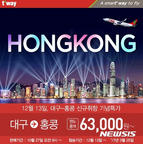 【서울=뉴시스】황의준 기자 = 국내 저비용항공사(LCC) 티웨이항공은 오는 12월13일 대구-홍콩 노선을 신규 취항한다고 26일 밝혔다. 국내 항공사가 대구-홍콩 노선을 운항하는 경우는 이번이 처음이다.