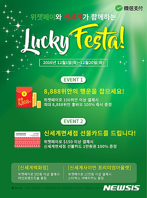 이번 프로모션은 신세계면세점(명동점/부산점), 신세계백화점(본점/강남점/센텀시티점), 신세계사이먼 프리미엄아울렛(전점), 스타벅스(명동/인천공항/제주 지역 내 매장), 위드미(전점)에서 위챗페이로 100위안 이상 결제하는 고객에게 최대 8888위안의 홍바오를 즉시 증정한다. (스타벅스, 위드미는 50위안 결제 시 최대 888위안 홍바오 증정, 모든 가맹점 대상 1인 1회 한정) 홍바오(紅包.붉은 주머니)는 위챗페이에서 사용할 수 있는 모바일 기프트로 888위안~8888위안까지 랜덤으로 증정한다.