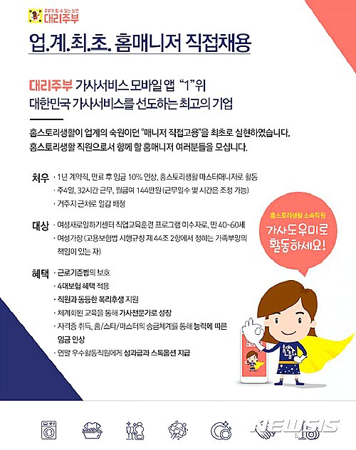 【서울=뉴시스】장윤희 기자 = 생활서비스 O2O 플랫폼 '대리주부'를 운영하는 홈스토리생활이 가사도우미 직원을 직접 채용한다고 20일 밝혔다.