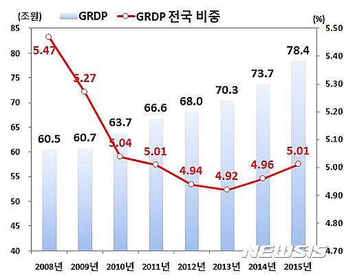 이어 2015년에도 78조4000억원으로 전국 비중이 5.01%로 증가돼 2년 연속 전국 비중이 높아진 것이다.