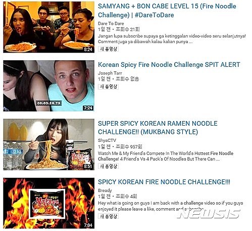 29일 현재 유튜브에 'Fire Noodle Challenge'라는 단어를 입력하면 29일 현재 무려 77만여개의 동영상이 검색된다. 모두 삼양식품의 불닭볶음면을 먹으며 매워서 어쩔줄 몰라하는 외국인들의 동영상이다. 아랍인여성, 미국인들, 동남아인들, 중국인들이 때로는 대결을 하거나 혼자 불닭볶음면을 먹으며 즐거워했다.