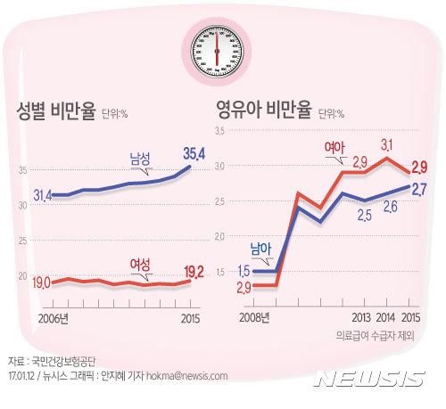지난 12일 국민건강보험공단이 최초로 발간한 '2016 비만백서'에 따르면 최근 9년간(2006~2015년) 비만·고도비만·초고도비만이 증가하는 추세다. 비만율은 26.4%에서 28.1%로, 고도비만은 2.5%에서 4.1%, 초고도비만은 0.1%에서 0.3%로 늘었다. 특히 영유아의 비만율은 2008년 1.4%에서 2015년 2.8%로 2배 증가했다. 성별로 보면 남아보다 여아의 증가속도가 가파르다.