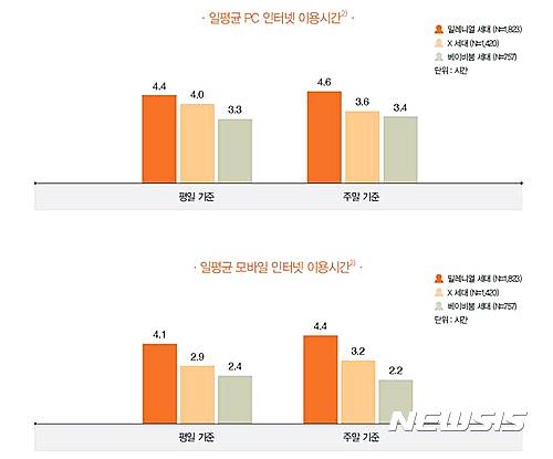 【서울=뉴시스】김종민 기자 = 1980년대 초부터 2000년대 초반 출생한 '밀레니얼 세대(millenials)'는 기존 세대들이 모든 세대를 통틀어 인터넷 이용시간이 가장 길었으며, 특히 모바일 기기를 통한 인터넷 이용시간이 다른 세대에 비해 1.4배 이상 많은 것으로 나타났다.