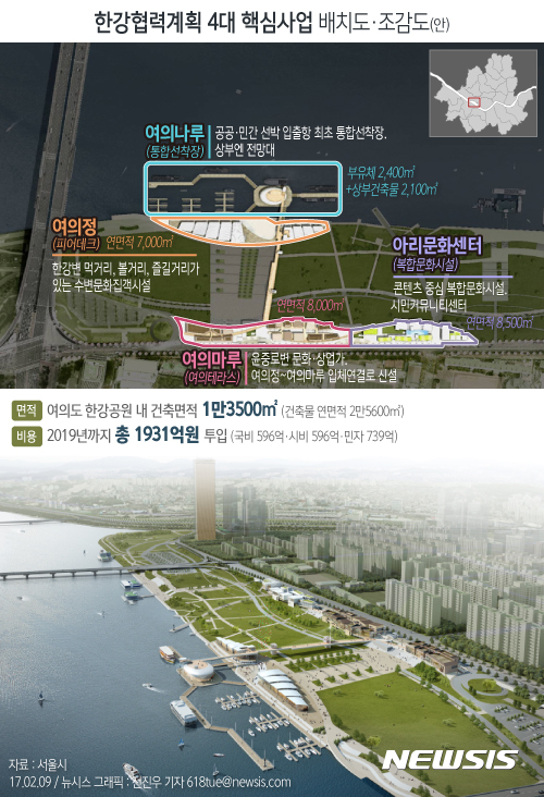 4대 핵심사업은 수상시설인 여의나루(통합선착장)·여의정(피어데크)과 육상시설인 여의마루(여의테라스)·아리문화센터(복합문화시설)다.