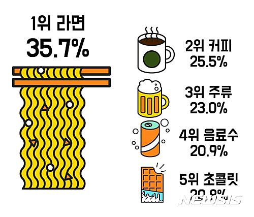 성인남녀들이 자주 이용하는 기호식품(북수응답)은 '라면'이 35.7%로 1위를 차지했다. 이어 ▲'커피'(25.5%) ▲'소주, 맥주 등 주류'(23.0%) ▲'음료수'(20.9%) ▲'초콜릿'(20.8%) ▲'유제품'(20.7%) 등의 순이었다.
