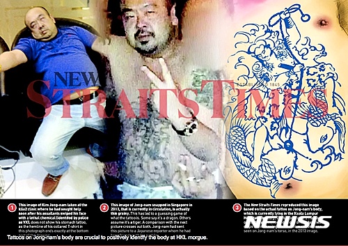 【서울=뉴시스】조인우 기자 = 유족과 연락이 닿지 않아 난항을 겪고 있는 김정남의 신원확인에 문신이 중요한 증거가 될 것이라고 3일 말레이시아 매체 뉴스트레이츠타임스(NST)가 보도했다.