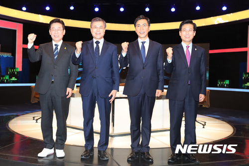 【서울·광주(전남)=뉴시스】전혜정 최선윤 윤다빈 기자 = 문재인 전 더불어민주당 대표와 안희정 충남도지사가 오는 27일 '광주 경선'을 앞두고 24일 열린 광주지역 TV토론회에서 시작부터 '문재인 대세론'을 놓고 팽팽히 맞섰다.