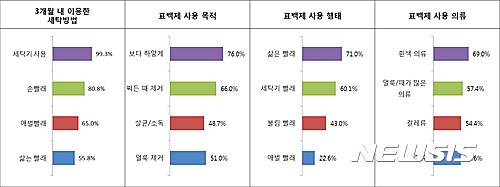 표백제를 사용하는 의류는 흰색 의류(69%), 얼룩/때가 많은 의류(57.4%), 걸레류(54.4%), 행주류(53.6%) 등으로 나타나 걸레류와 행주류 세탁에도 표백제를 사용하는 것이 눈에 띈다.
