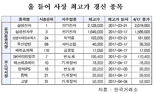 거래소 관계자는 "사상 최고가를 경신한 종목에서는 코스피 코스닥 시장의 시총 순위 상위사가 다수 포함돼 있다"고 말했다.