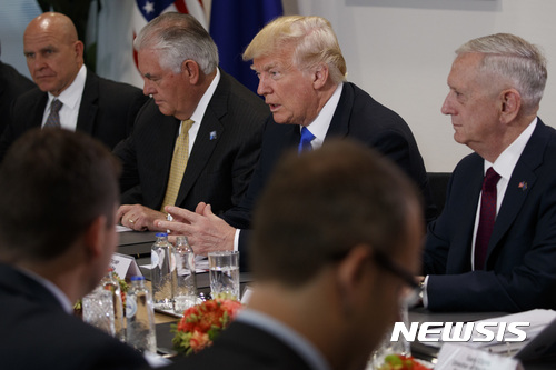 【서울=뉴시스】박영환 기자 = 부임 이후 처음으로 북대서양조약기구(NATO) 정상회담에 참석한 미국의 도널드 트럼프 대통령이 25일(현지시간) 회원국들에 방위비 분담금을 늘리라고 압박하면서도 '집단안보원칙'에 대해서는 '두루뭉술'한 태도를 유지했다.