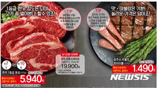 일반적으로 '스테이크'라는 단어와 함께 떠오르는 한우 1등급 등심(100g)은 행사가 6980원, 호주산 곡물우 척아이롤(100g)은 1650원에 판매한다. 여기에 롯데/kb국민/신한카드로 결제하면 각 5940원과 1490원의 추가 행사가에 만나볼 수 있다.
